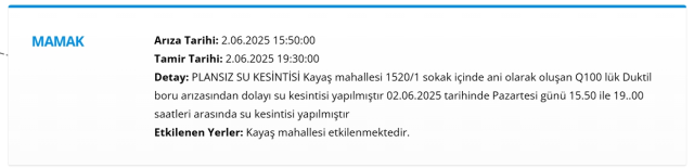 Detay: PLANSIZ SU KESİNTİSİ Kayaş mahallesi 1520/1 sokak içinde ani olarak oluşan Q100 lük Duktil boru arızasından ötürü su kesintisi yapılmıştır 02.06.2025 tarihinde Pazartesi günü 15.50 ile 19..00 saatleri ortasında su kesintisi yapılmıştır