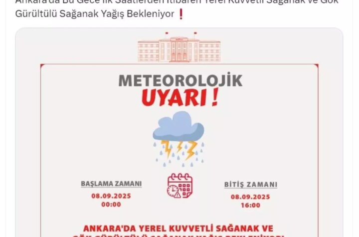 Ankara Valiliği, 8 Eylül Pazartesi gece saatlerinden itibaren Ankara genelinde mahallî olarak kuvvetli sağanak...